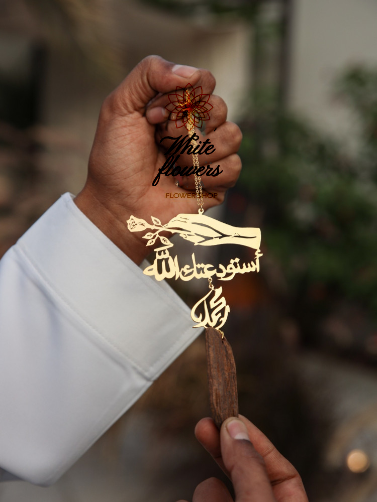 تعليقة سيارة عود برسمة يد بعروق الورده مع الاسم بتصميم راقي بطلاء ذهب أو فضة. أجمل هدايا رجالية وتعليقات سيارة.